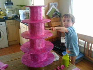Instead, I have the cardboard box that my son’s car seat arrived in.  I draw around various trays and plates and get my husband to cut them out.  To create tiers there are rectangles of cardboard coiled into circles.  When it is done I bring it indoors to cover it with pink tissue paper and PVA glue (a technique I have not used since my days as a foundation art student).  My son is understandably fascinated by the new cake stand and determined to help as you can see above.