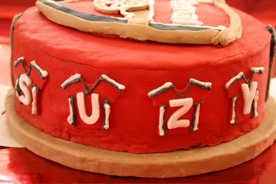 This time I covered the cake with chocolate ganache from Planet Cake rather than two layers of fondant. It was also my first time piping with royal icing. This was nerve wracking but I think I did a better job of it than the fondant work. For the football shirts around the edge I used a mini cookie cutter for a baby-grow with the bottom trimmed off. I used my Nigella Lawson A-Z cookie cutters for the lettering. For the Arsenal lettering which was in lower case I manipulated different letters to stay faithful to the typography. If I was making the crest again, I would allow wider pieces of the fudge colour to go around the edge because I hadn’t accounted for what it would look like sideways on. I got around this by inserting more panels of the same colour but it would have looked neated if one single piece of sugarpaste had been tucked under.