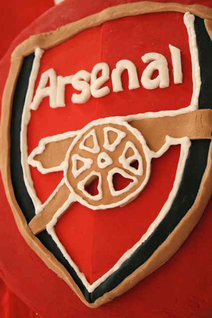 This time I had none of the food colouring problems that beset The Very Hungry Caterpillar cake, I was using my new Wilton gel food colouring pots and although I had to use quite a lot to get the colour this intense, gel food colouring doesn’t seem to create the same bitter taste that haunts icing made with large quantities of liquid colouring. I also managed to mix convincing shades of “gold” and navy for the Arsenal crest.