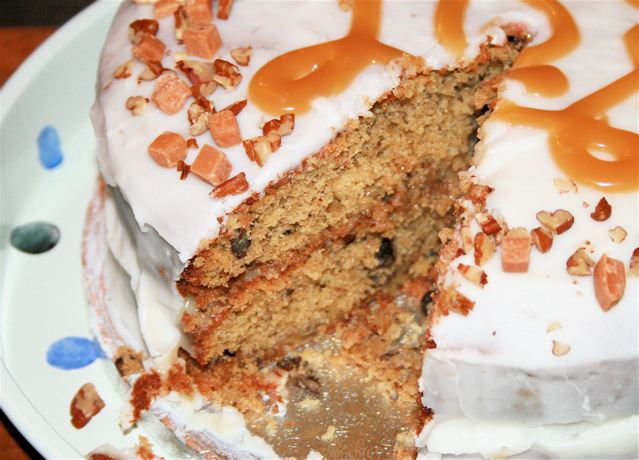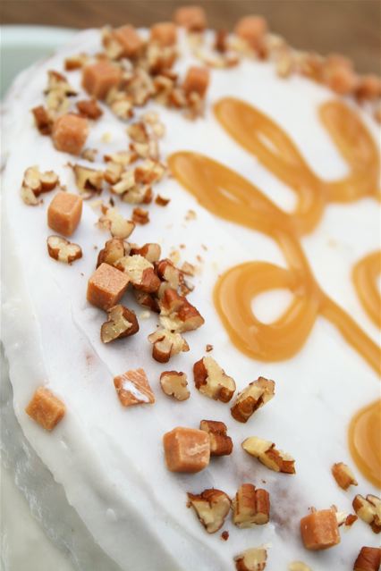8. Using a small palette knife, spread the Banana Cream Cheese Icing over the whole cake in as thin a layer as you can but so the sponge does not show through. Sprinkle chopped pecans and fudge chunks around the edge of the cake to decorate. Put in the fridge for at least two hours to harden off the surface before drizzling over the toffee sauce.