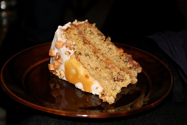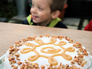 9. Fill a disposable piping bag with half a cupful of the toffee sauce to drizzle over the cake in the pattern of your choosing. You can either put the cake in the fridge again to harden the toffee sauce or serve straight away. As you can see in the picture below, the sauce goes back to a runnier caramel at room temperature. If you don’t want to fuss with piping you could just let it run off a teaspoon in zig zags.