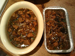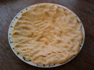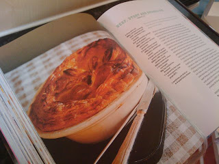 Hot water pastry is very easy to make. All the wet ingredients are piled in a well within the dry ingredients and the whole thing mixed. The warm dough spreads across a plate very easily and cools in about 15 minutes after which you put it in the fridge for half an hour. I left mine slightly longer as the beef was still simmering. The recipes suggests making several individual pies or one big one. I made two medium size pies: