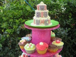 Then it was the moment of truth, arranging my cupcakes on the tiers and best of all putting my Big Lunch white chocolate cake with marzipan letters on the top. There were the perfect number of cupcakes to fill all the tiers and I was very pleased to hear lots of compliments – though admittedly as many of these were about the pink cake stand as the cakes!