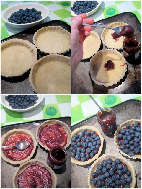 3. Allow the cases to cool for a while before filling but they do not need to be completely cold.  Spread the cinnamon paste over the base of the cases and fill generously with blueberries.
