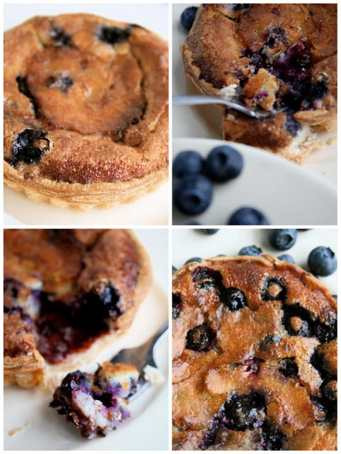 Blueberry Cinnamon Tarts: A golden blueberry tart on a white plate with raw blueberries and a fork.