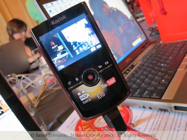 Our cameras were about the size of a Blackberry with just five buttons on the front to adjust settings, delete, record/navigate and switch between record and play mode. Also in our kits was a mini tripod that screws into the base for hands free recording and various wires to play stuff back on the TV or upload to the computer.
