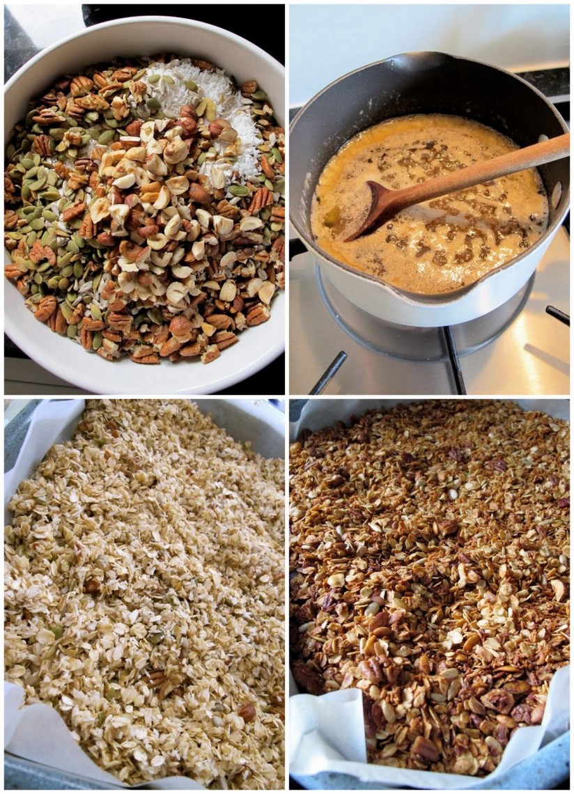2. Place the butter, honey and vanilla extract in a small saucepan on a low heat and gently melt together. Mix the oats, nuts, seeds and coconut together in a large bowl. Pour over the melted butter and honey mixture and stir ensuring all the dry ingredients are coated.
