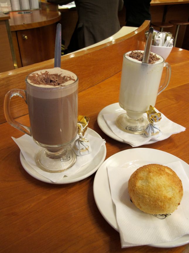 Seated opposite a mesmerising flat screen tv showing a loop of what can only be described as chocolate porn, we each ordered the hot chocolate – one white and one normal and shared a coconut macaroon. Since I have made so many macarons, I thought I ought to try the coconut macaroon version. I think I’ll stick to the French style in future but it made a nice change.