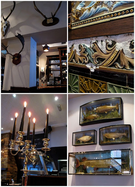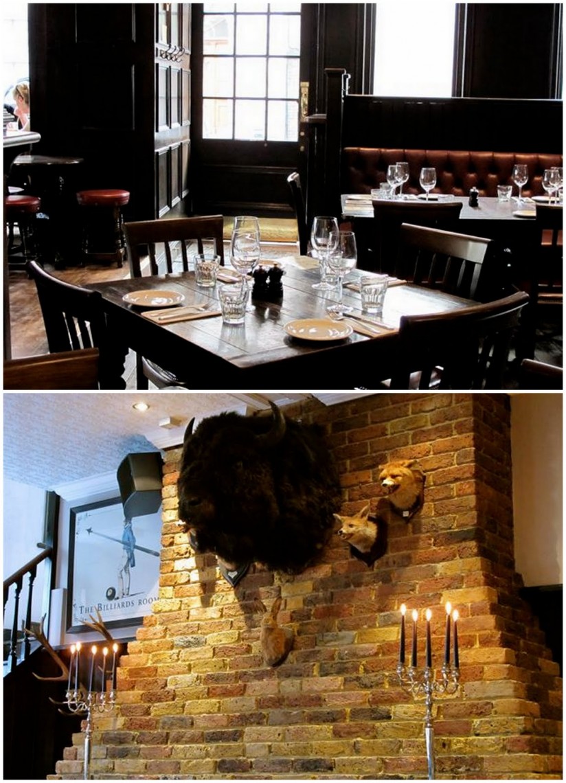 They should feel at home here. The interior of the Cadogan Arms dining room might be described as faded grandeur nouveau, stuffed animals in mothy glass cases and chipped vintage tiles sit alongside expensive leather seating and candelabras. Vegetarians be warned!