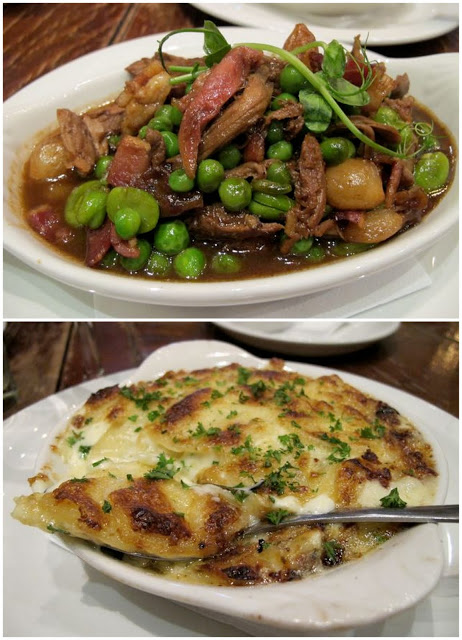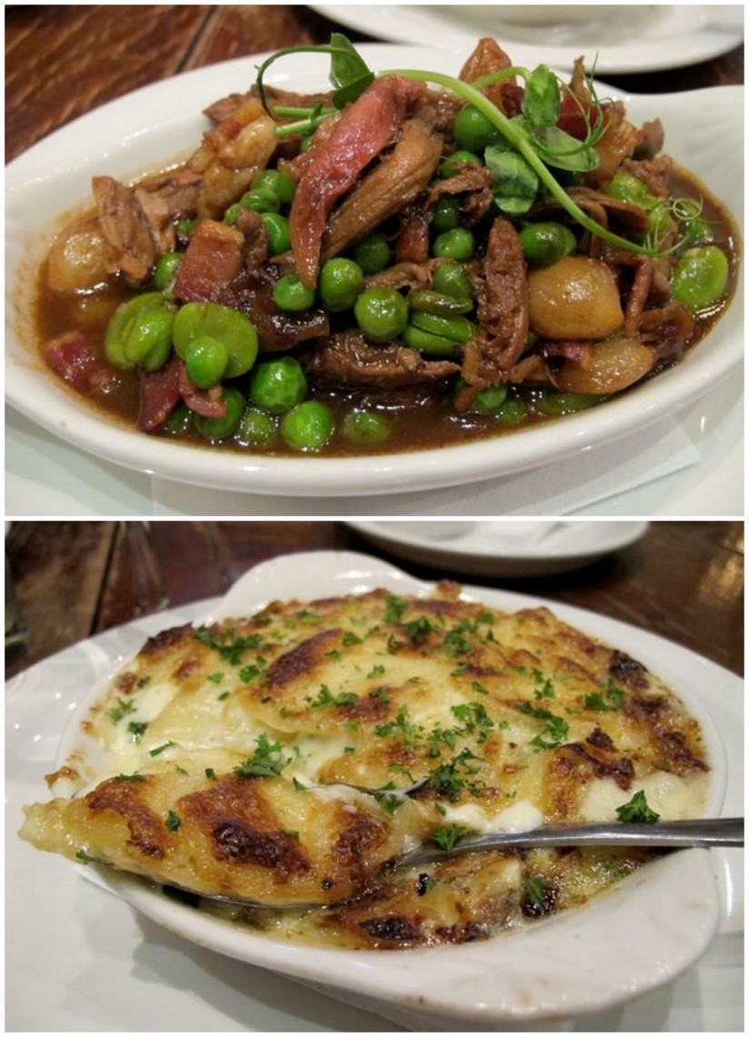 Top: Pot roasted Gressingham duckling, bacon, peas, broad beans and pearl onions – £16