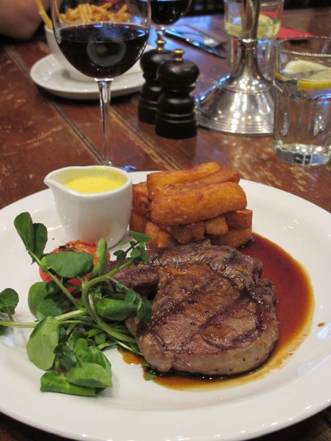 Two of us ordered rare steaks which arrived with big fat Jenga style chips (which seems to be the standard way to serve them these days). The French diner amongst us enthused that the Bearnaise was “out of this world”.