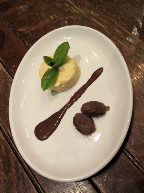 For dessert, my honeycomb parfait was soft and cold with a smooth texture and tasted pleasingly like a grown up version of Cadbury’s Crunchie. I’m no madeleine expert by any means but the little cakes struck me as too fudgy to be madeleines. The streak of chocolate sauce down the middle of the plate could have had more finesse if it had been in a swirl rather than plonked down the middle. It looks like the cakes and the parfait are having a standoff with each other.
