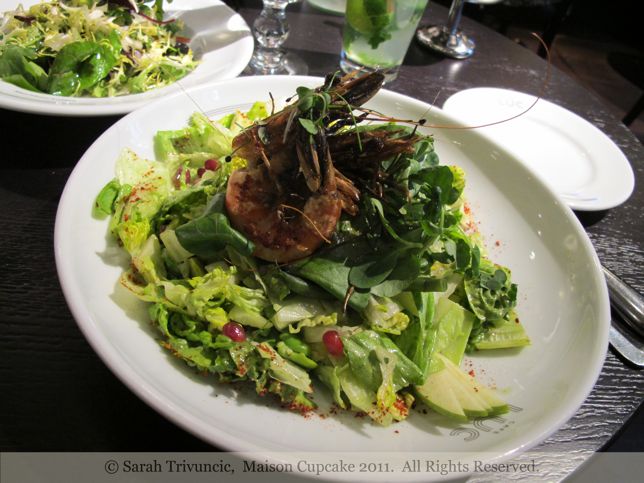 For twelve pounds you get two lonely prawns perched on a mountain of lettuce, a few frozen broad beans, some celery, apple, occasional roasted pine nuts and pomegranate seeds (huh?). The combo does not work.