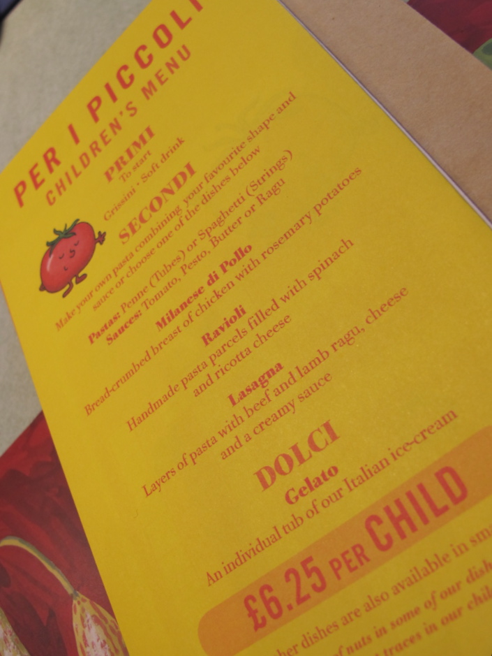 We each opted for the £10 two course menus and Ted enjoyed the £6.25 children’s menu. During our visit this featured a cup of grissini breadsticks, a choice of penne or spaghetti with either tomato, pesto, butter or ragu; ravioli, lasagne or breaded chicken with potatoes. There’s an individual tub of ice cream for pudding and an attractive pack of colouring materials featuring a jigsaw and wooden pencils (much nicer than those cheap wax crayons that snap straight away).