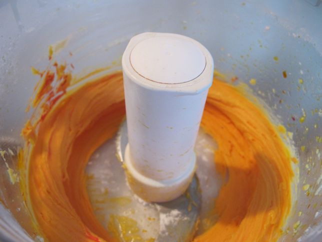 6. Using a cocktail stick, add spots of yellow and red gel colourings and pulse the food processor until a satisfactory orange colour is obtained.