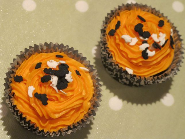 7. Spread the icing on the cake bases using either a small palette knife or pipe it on. Decorate by piping tiny pupils with the dark icing onto the marshmallow pieces and press carefully into the buttercream. Push each half of a chocolate orange segment into the buttercream to make bat’s ears. Alternatively you can just use a tube of usual sprinkles like I have in these cakes below left.