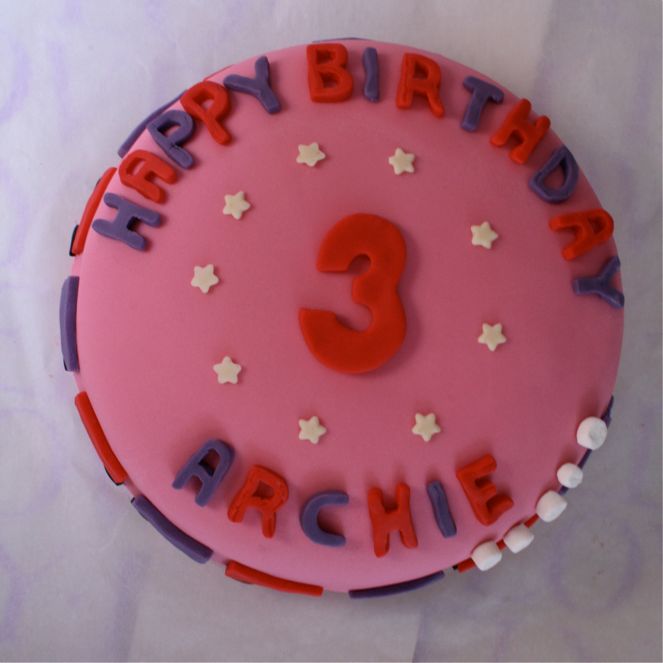 Here is Archie’s pink round cake. As ever, I was pushed for time when it came to taking pictures before collection and missed off the front of the train here! The marshmallows you see are puffs of smoke coming out of the engine. I had initially intended to use sweets or licorice all sorts to make the wheels but when it came to it, they wouldn’t stick properly and became black fondant balls instead. I cut the letters out using my Nigella Lawson Living Collection alphabet cookie cutters. If you look at the reviews on Amazon for these cutters you’ll see people bemoaning that they’re too small to make cookies. I think people are missing the point,they’re ideal for spelling words out on cakes.