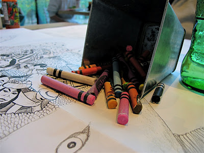 Proper crayons were a good start. A tin pot, rather than packs of pencils that merely scratch paper. Wahaca’s fold out newsletter featured black and white illustrations waiting to be adorned in wax. Colouring books don’t come much more funky than this.