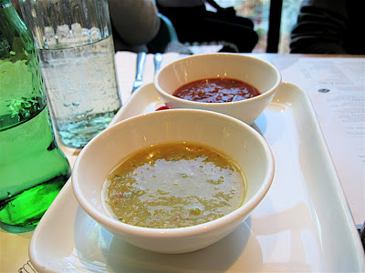 You are also served two types of hot dipping sauce. Keep them away from tiny tongues.  My husband drank a Mexican beer, Ted had fruit juice with a straw.