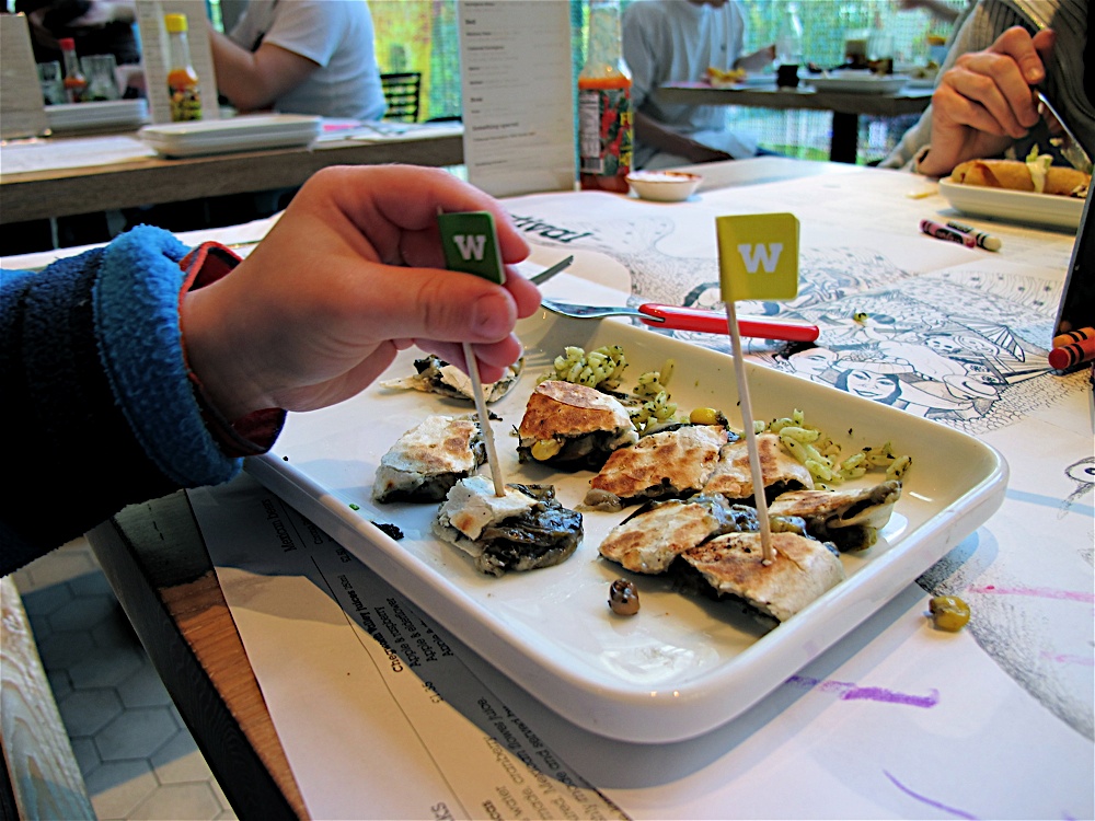 What about nourishment for those on solids but delicate tummies?  I present to you the Quesadilla Huitlacoche, £3.59, a toasted tortilla filled with Mexican corn mushroom, British field mushrooms and lots of melted cheese. In plain English, it’s a non spicy cheese toastie. Ted tucked in and played with the cute W flags on sticks.