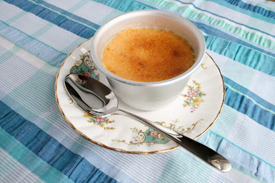 3.  Grease 4 6fl oz ovenproof dishes (I used little pudding basins). Fill each dish with a generous tablespoon of lemon curd. Pour the mixture through a strainer into the dishes.  Place in a deep baking tray and pour enough hot water to come halfway up the sides of the dishes.  Bake for 35 minutes or until just set.  Serve warm or cold.