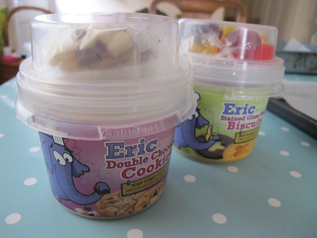 Earlier in the year, Sainsbury’s sent me a trio of Eric’s cookie dough kits from their kids’ home baking range to put through their paces with Ted. The plastic pots look quite space age themselves. Possibly I could do a Red Ted Art craft activity and turn them into little astronauts?