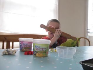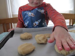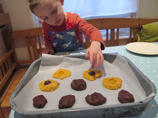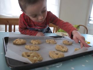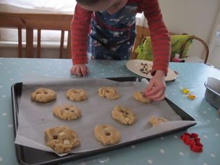 Space age rocket apron donned and rolling pin in hand we got to work making little balls of dough for the chocolate chip cookies. Ted made the choc chip dough balls easily although I had to supervise they were spaced 5cm apart and evenly sized. Less generous than me, Ted placed a single chocolate chip on each but was very pleased with himself all the same.