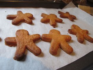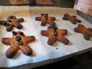 On a previous occasion we made the gingerbread men on two trays of six incase they spread. Surprisingly, they barely spread at all but demonstrated that 12 minutes prescribed cooking time was too long resulting in burnt raisins. The second ones only had 10 minutes, minus raisins.
