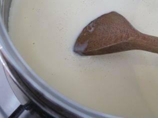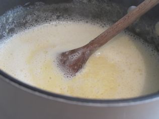 3. In another pan, whisk the egg yolks with the sugar until thick and creamy. Stir in the cream mixture beating all the while and then returning to a low to moderate heat. Stir continuously for 8-10 minutes.