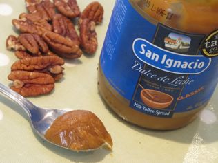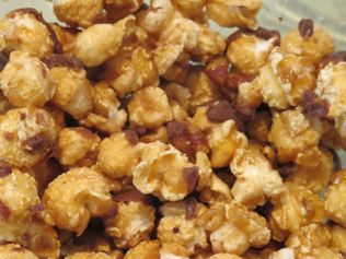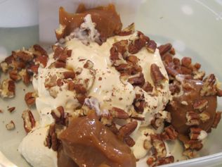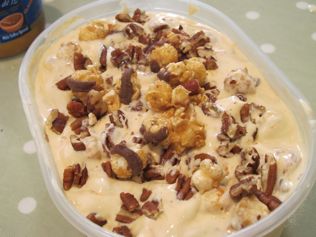 6. Finally tip your ice cream into a tub for freezing. Before placing in the freezer, stir in the popcorn, Dulce de Leche and pecans with a spoon saving a small handful of popcorn and nuts to sprinkle on the top. Also at this point, if you are adding amaretto, stir that in now. Some booze added to homemade ice cream does make it awfully easier to scoop out later! Freeze for at least several hours before serving.