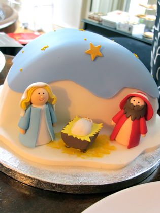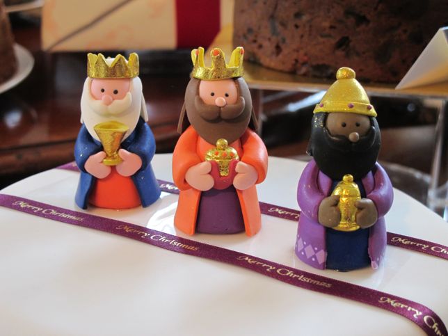 Much more polite than the cartoon grumpy Father Christmas are these Three Kings and fondant nativity cake.