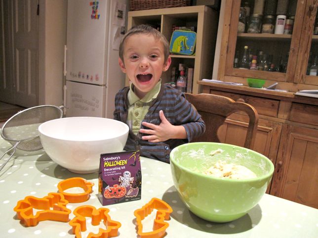 Ted has been fascinated by Halloween today, he supervised my husband cutting the pumpkin (shown below) and has escorted each of us to the door with the tray of halloween cookies each time a group of trick or treaters arrived. I am definitely regretting not dressing him up now… next year I shall send him and my husband out to do it properly. Meanwhile, I dread to think what will happen later with all the sugar he’s eaten this evening. Something tells me to brace myself for what usually happens if he has a Slush Puppy… wide awake and singing at 2am. Oh dear.