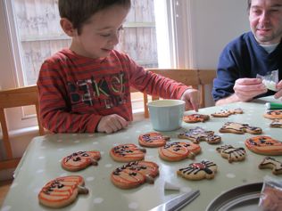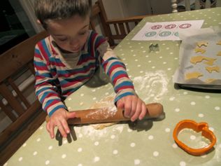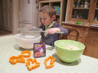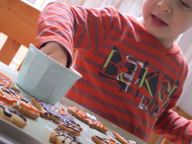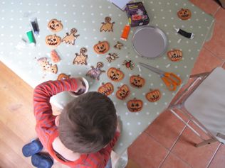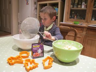 Ted loves helping in the kitchen now and he got very excited about these halloween cookies. As you will see by the various costume changes in these pictures the halloween cookies were made in several sittings – first the dough, which was made before our holiday in Montenegro and frozen until we came back, secondly the baking and lastly the cookie decorating.