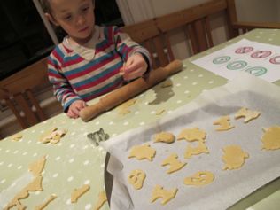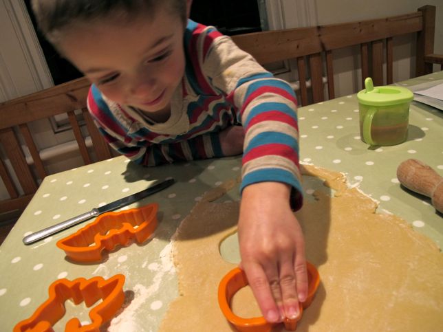 • Sprinkle your work surface with flour, place a disc of dough on it, and sprinkle a little more flour on top. Roll out to a thickness of about 5mm. Cut out your shapes and space well apart on the baking sheets.