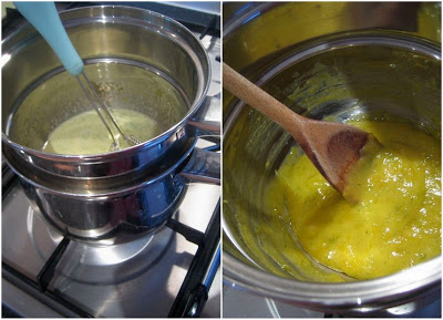 Transfer the mixture to the top of a double boiler or place your bowl over the pan/ pot with simmering water. Cook the egg mixture over low heat, stirring constantly, for about 8 minutes or until it resembles thick custard. It may bubble a bit as it reaches that consistency.