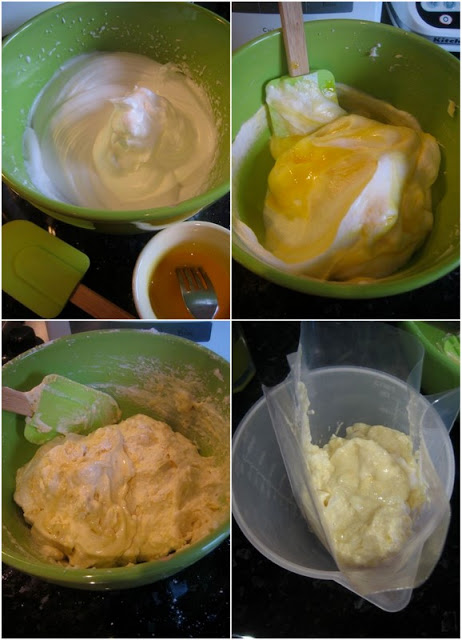 In a small bowl, beat the egg yolks lightly with a fork and fold them into the meringue, using a wooden spoon. Sift the flour over this mixture and fold gently until just mixed. It is important to fold very gently and not overdo the folding. Otherwise the batter would deflate and lose volume resulting in ladyfingers which are flat and not spongy.