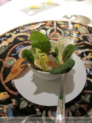 After choosing from 6 types of fresh bread (we had beer bread and sour dough), our first course was salad of pot-caught Cornish wild crab, mango and oscietra caviar. An overture to a lengthy menu, this dish was very light and subtle in flavour. I did find the decorative charger it was served on a bit distracting.