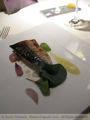 The final starter course is a salad of grilled wild hand-line Cornish MSC mackerel and pickled radish with a Braeburn apple sauce streaked alongside. These are simple components but seem to come together with deceptive effortlessness.