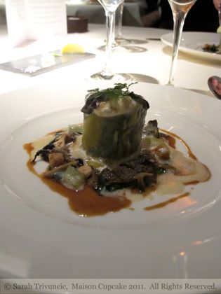 First pudding course was an exotic fruit raviole with kaffir lime leaf and coconut jus. Less is more with the presentation of this dish, at a point in the meal where we were starting to feel full, this course was the culinary equivalent of standing under a cold sprinkler on a hot day; blissfully cooling and refreshing us to make it to the finish line.