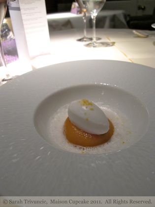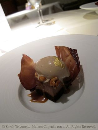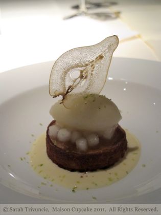 So the 9th dish was almondine covered in pear pieces and pear sorbet in a ginger sauce with caramel croustillant and a wafer thin translucent slice of pear standing on top. The coldness of the pear bouncing off the caramel-ly crunchy base made a fantastic contrast in both texture and flavour.