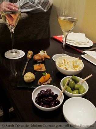 Seated in the lounge, it looks like the restaurant is very busy, even for a Monday in January. Despite not eating for 8 hours, I didn’t want to peak too soon and resisted the popcorn and olives. A tile bearing five amuses bouches gave a flavour of things to come, however bear with me when I say we held back from eating these for our menu of choice, the découverte bore 9 courses. Well, actually it was 10 if you have cheese.