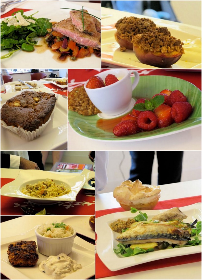 Top row: Helen’s veal with tomato, caper, garlic and olive sauce, Ireena’s baked nectarines with amaretti crumble topping and mascarpone orange cream;