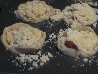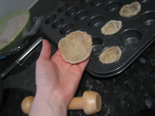 2. Fashion little baskets of pastry by flattening little discs with your fingers and pushing into the holes in the tin. Marvellous! No need to roll out the pastry!