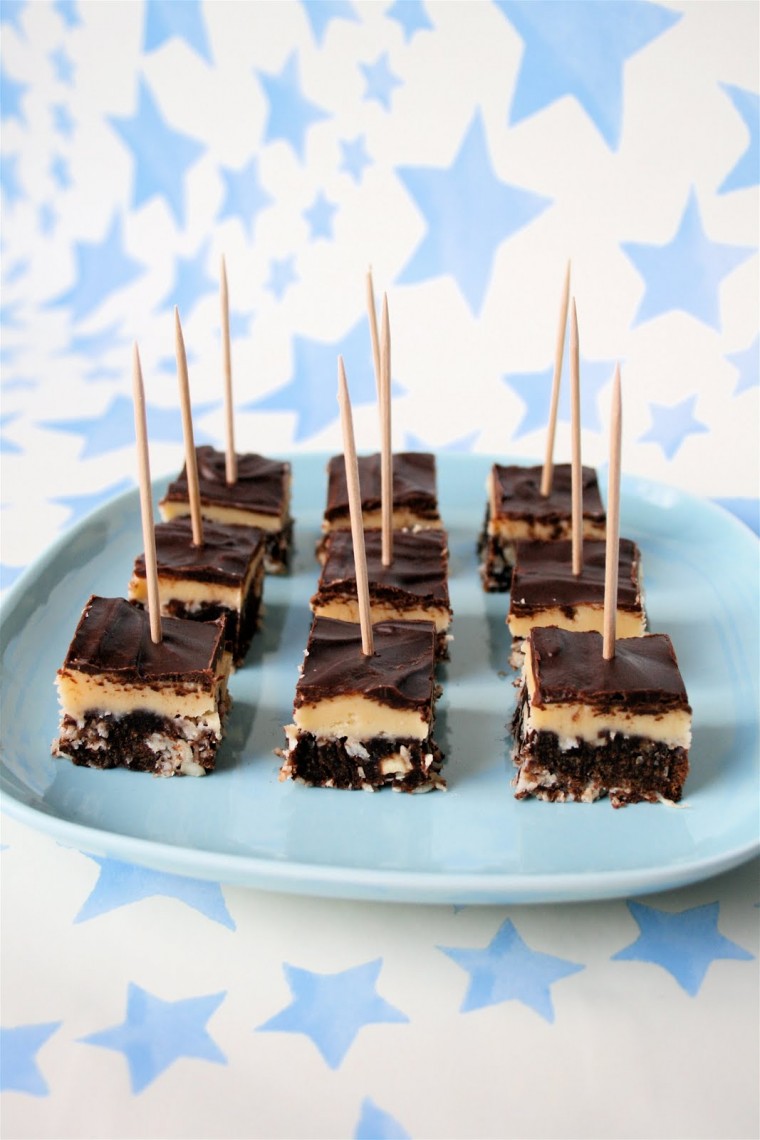 To present my bars, I chose to cut them into smaller cubes and spear with cocktail sticks. The bars are very sweet and I could only handle small quantities in one go. The tiny bits I tasted were very nice and have been one of the many things to tempt me this week whilst I am still steadfastly sticking to Ten in 10, the healthy goals ten week challenge spearheaded by Recipe Girl.