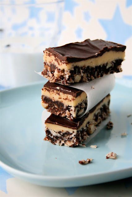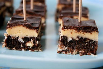 3. For Top Layer: Melt chocolate and unsalted butter over low heat. Cool. Once cool, pour over middle layer and chill.