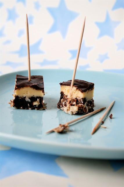 Bitesize Nanaimo bars cut into chunks and speared with cocktail sticks on a light blue plate.