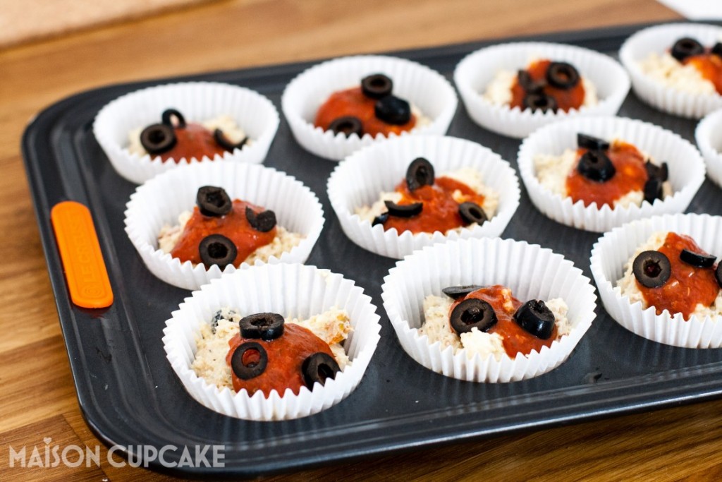 - Spoon the batter into the muffin cases. Then spoon a little bottled pizza sauce over each muffin, scatter with some olive slices and bake for 14 minutes.