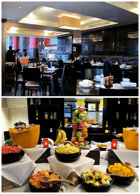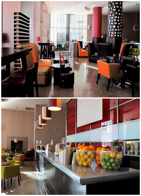 The bed was high and comfortable, I loved the velvet striped cushions infront of the pillows. The artwork was black and white photos of buildings around the city.  The bathroom was not very exciting, there were no bathrobes on the back of the door and there could have been more toiletries.  Those that there were were in generous sizes and although I normally frown on my husband’s habit of hoarding the freebie miniature shower gels (his idea of a joke, he knows it bugs me), they were nice enough and after a one night stay, there was plenty left to justify taking it away.