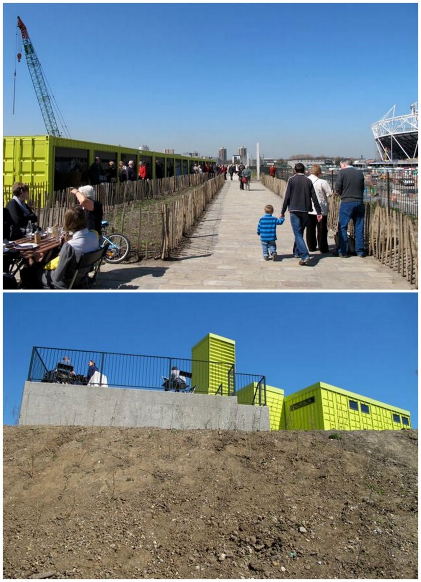 Londoners can get a bird’s eye view of the 2012 site at The Container Cafe housed in the View Tube, a structure made from lime green painted shipping containers situated on a raised bank looking over the works.