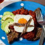 - To serve, top the rye toast with cooked down tomatoes and the poached egg. Criss cross with two more whole anchovies each and a fan of ripe avocado slices.